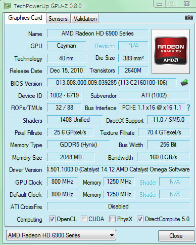 Installiere mal bitte GPU-Z und mache einen Screenshot. Soweit ich mich erinnern kann, hast du ne AMD 69x0