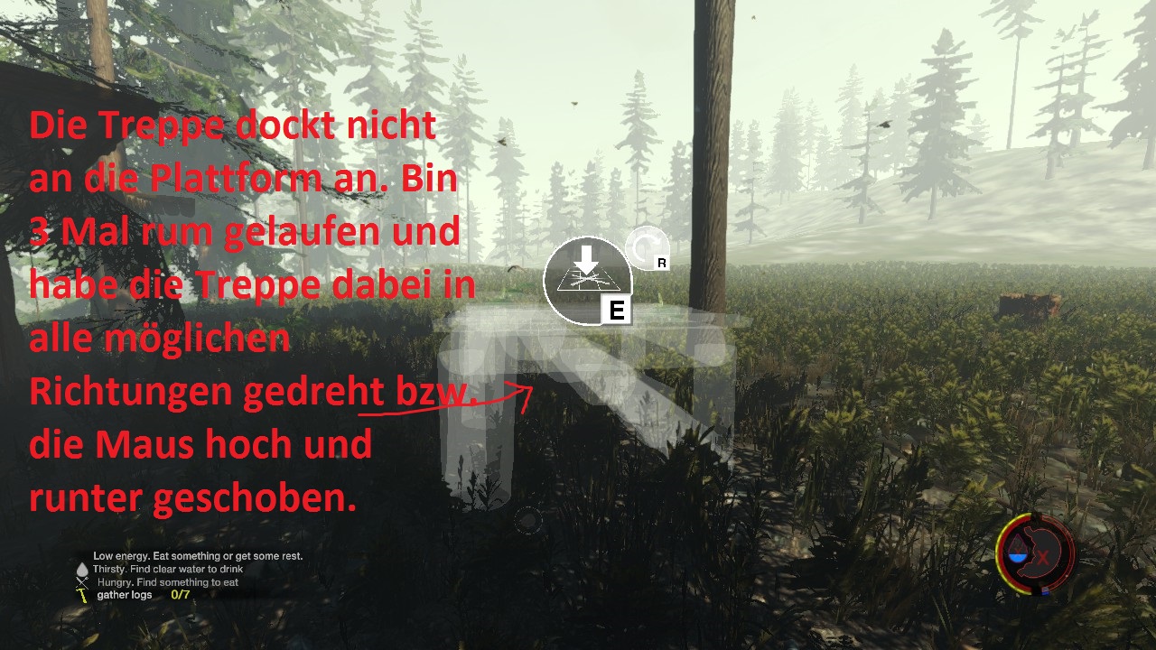 ich bin noch relativ neu bei The Forest und habe eine Bau-Frage: Wie mache ich höhere Treppen? Ich kenne es nur von Gronkh, dass ich eine Plattform baue und darauf eine Treppe "andocke". Aber das funktioniert bei mir einfach nicht, egal aus welche Richtung ich die Plattform anschaue, die Treppe bleibt immer auf dem Boden. Gibt es da eine neue Methode?