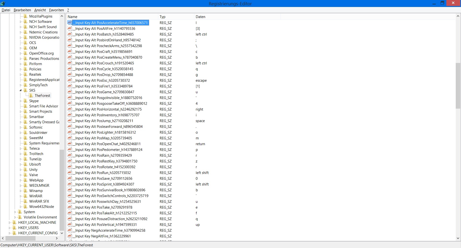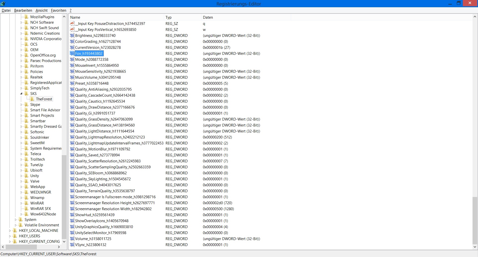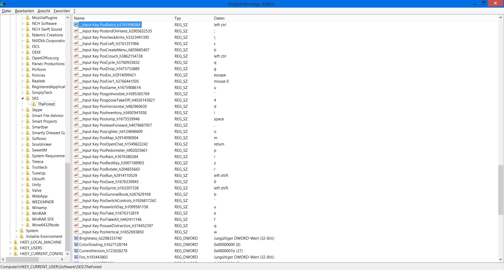 In der Registry findest du hier die Informationen: HKEY_CURRENT_USER\Software\SKS\TheForest - bin gespannt ob da was drinsteht bei dir, sonst einfach Screenie machen wenn du dir unsicher bist