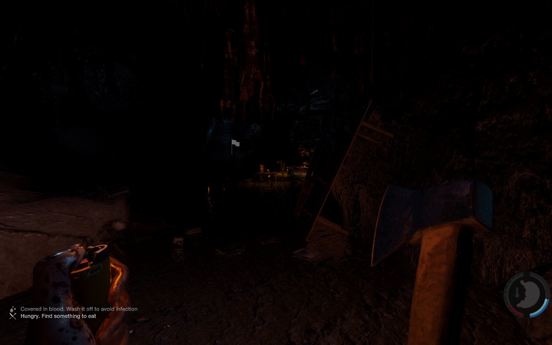 Seit der Alpha 0.03 ist die Holzhütte nicht nur einfach eine Hütte, für die man sich die Hände wundholzt, sondern bietet auch die Mögllichkeit sich zu verstecken (da Türe) und zu speichern (da nette Polster, Zeitschriften und ein Liegeplatz)