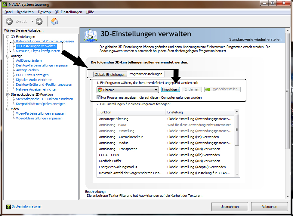 Über die Nvidia Systemsteuerung (Rechtsklick auf freien Platz am Desktop -> "NVIDIA Systemsteuerung") unter dem Punkt "3D Einstellungen verwalten" bei den "Programmeinstellungen" entweder TheForest.exe aus der Liste wählen oder über den Knopf "Hinzufügen" in die Liste eintragen. Vorzugsweise lasst ihr die Einstellungen mit "Globale Einstellung" oder "Anwendungsgesteuert" in der Auflistung darunter.