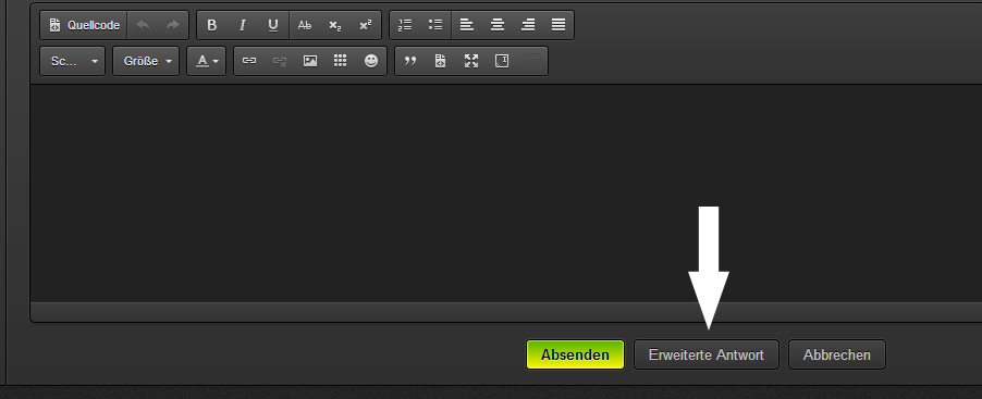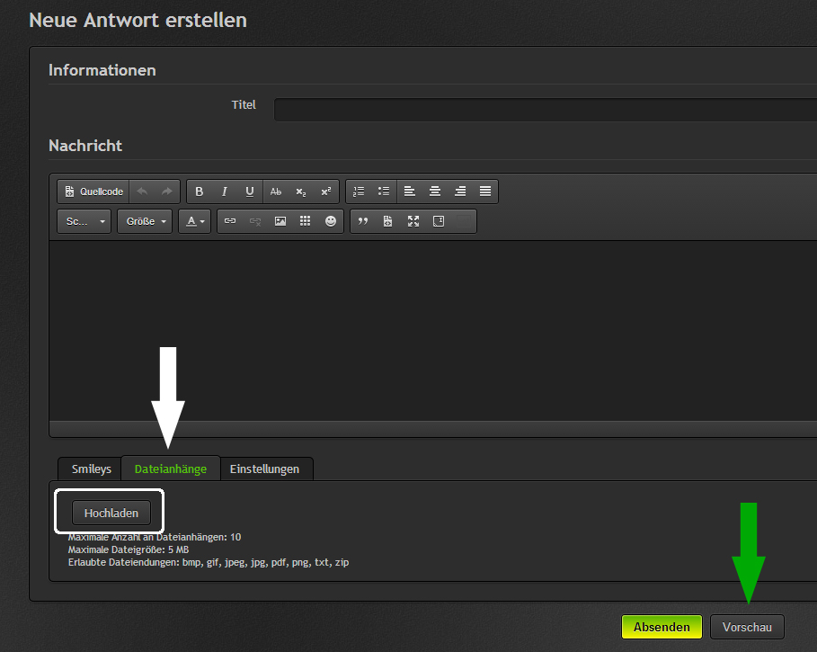 Sobald der Knopf "Antworten" gedrückt wurde, damit das Eingabefeld herauskommt, kann man neben Absenden auch Erweiterte Antwort anklicken. Es wird die Seite neu geladen, der Text bleibt erhalten, neue Funktionen kommen hinzu: Klickt nun unter dem Eingabefeld auf "Dateianhänge" und dann entweder auf "Hochladen" oder zieht Dateien auf die Schaltfläche "Hochladen"
