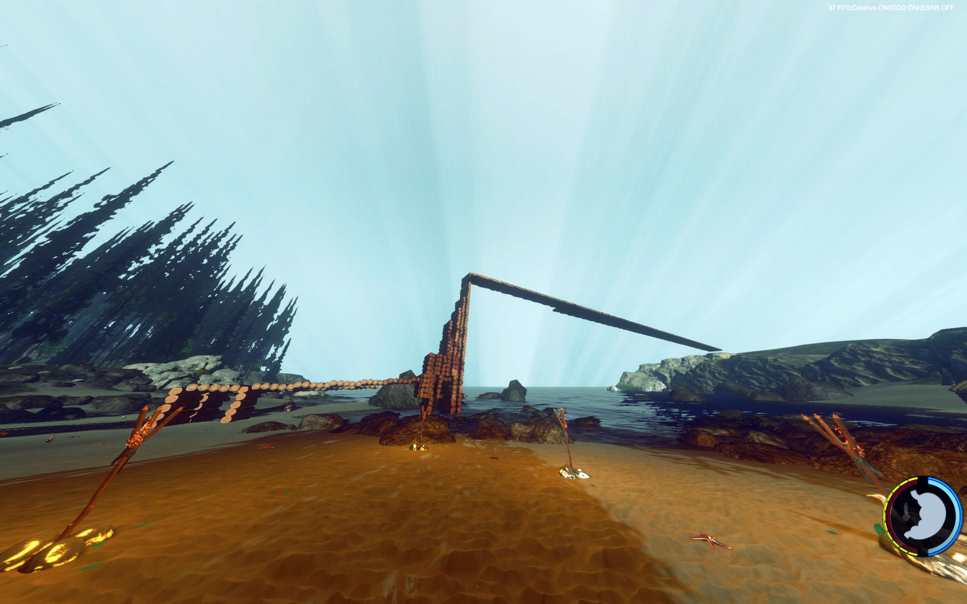 Nachdem ich durch @Lowrider36 es endlich geschafft hatte zu kapieren wie ein einfacher Brückenbau funktioniert, hab ich mich diesmal an einen Versuch rangemacht und echt was Tolles gezaubert. Der Bau selbst lief tatsächlich mit einem Auf und Ab ab da ich das vorletzte Blueprint immer gebaut habe und um an das letzte Stück anzudocken immer über dieses gesprungen bin um im richtigen Moment E zu drücken damit das nächste Teil vorne andockt. Kaum unten (meist im Wasser) angekommen, bin ich wieder raufgelaufen und hab alles wiederholt.
