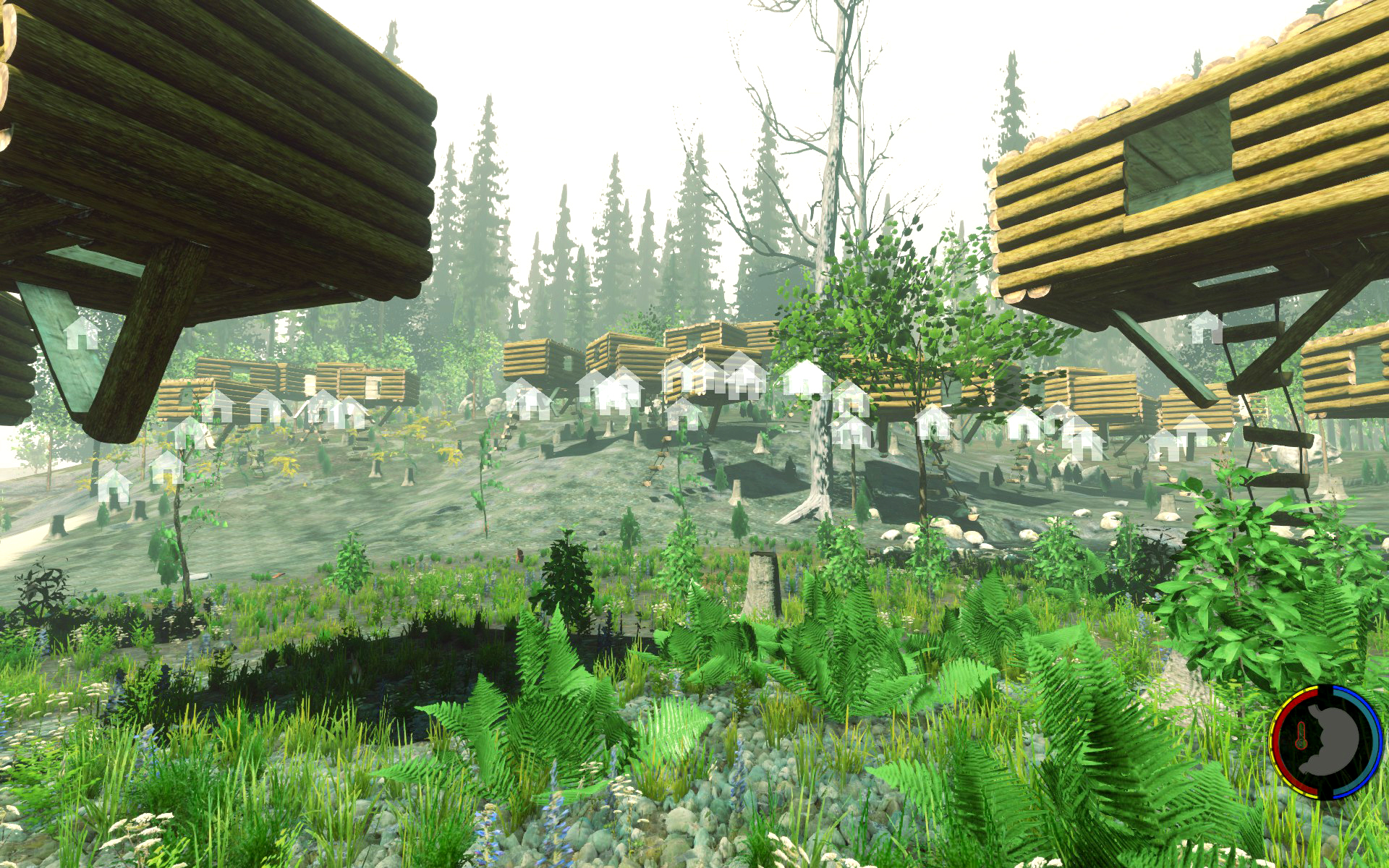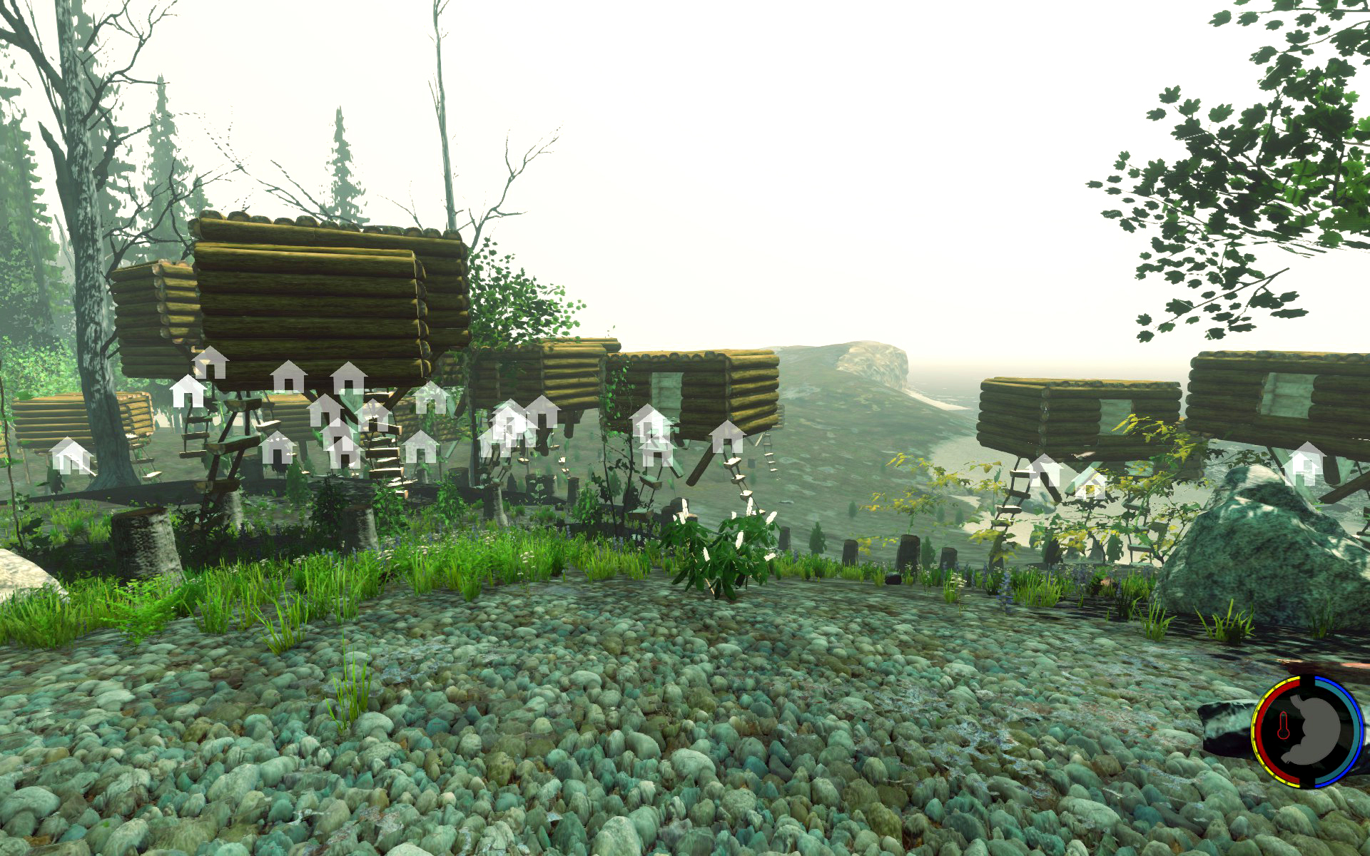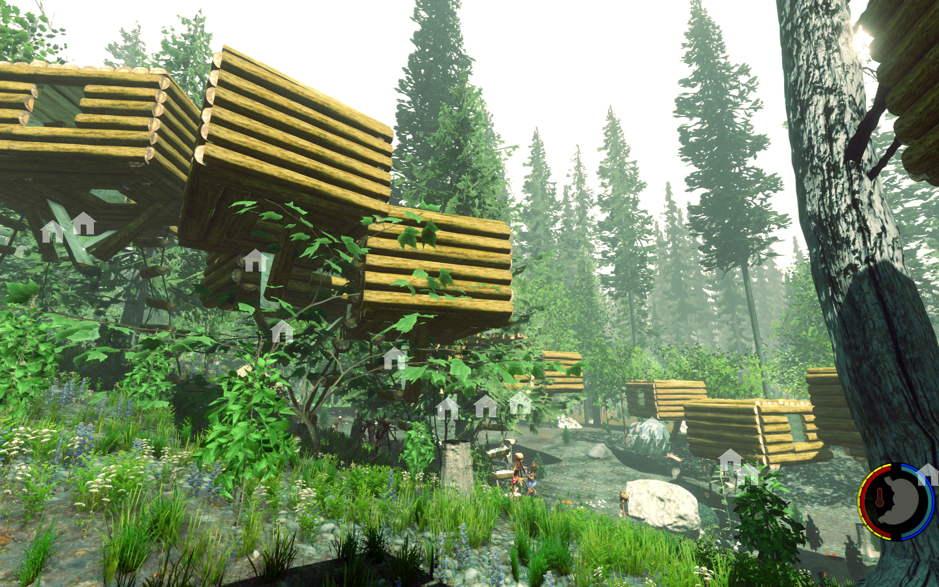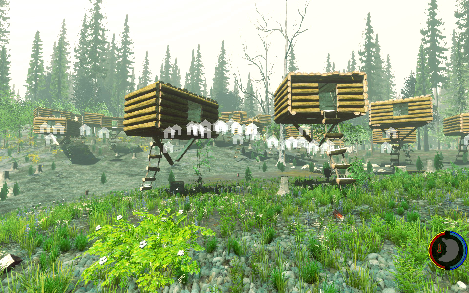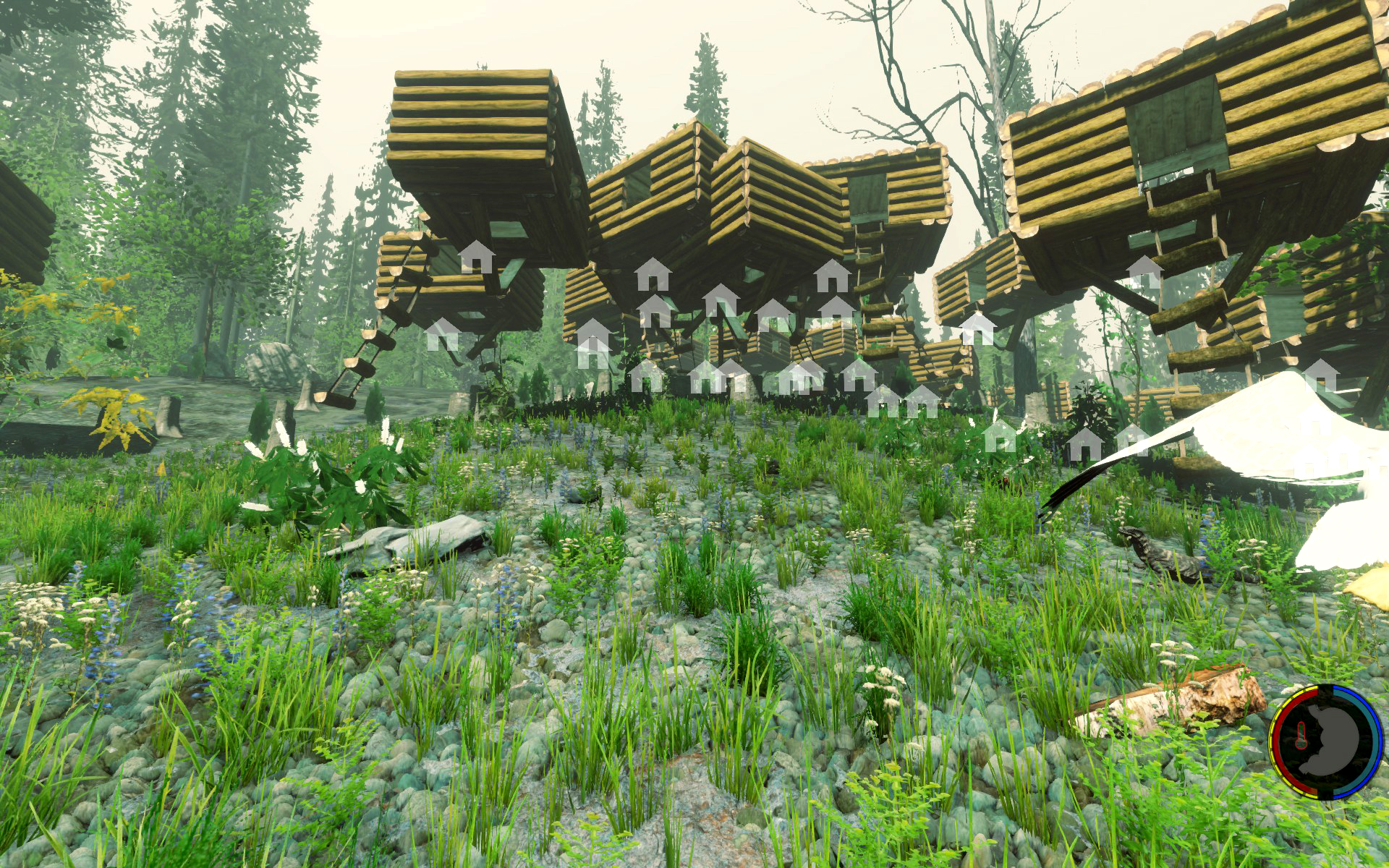 Aufgesetzt wie üblich auf Bäumen, der Rest rundherum wurde abgeholzt so dass die Baumhäuser wie schwebend wirken