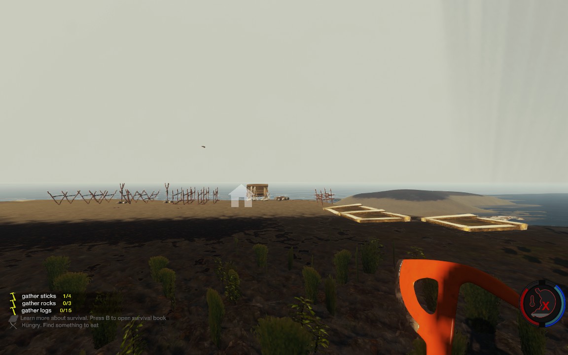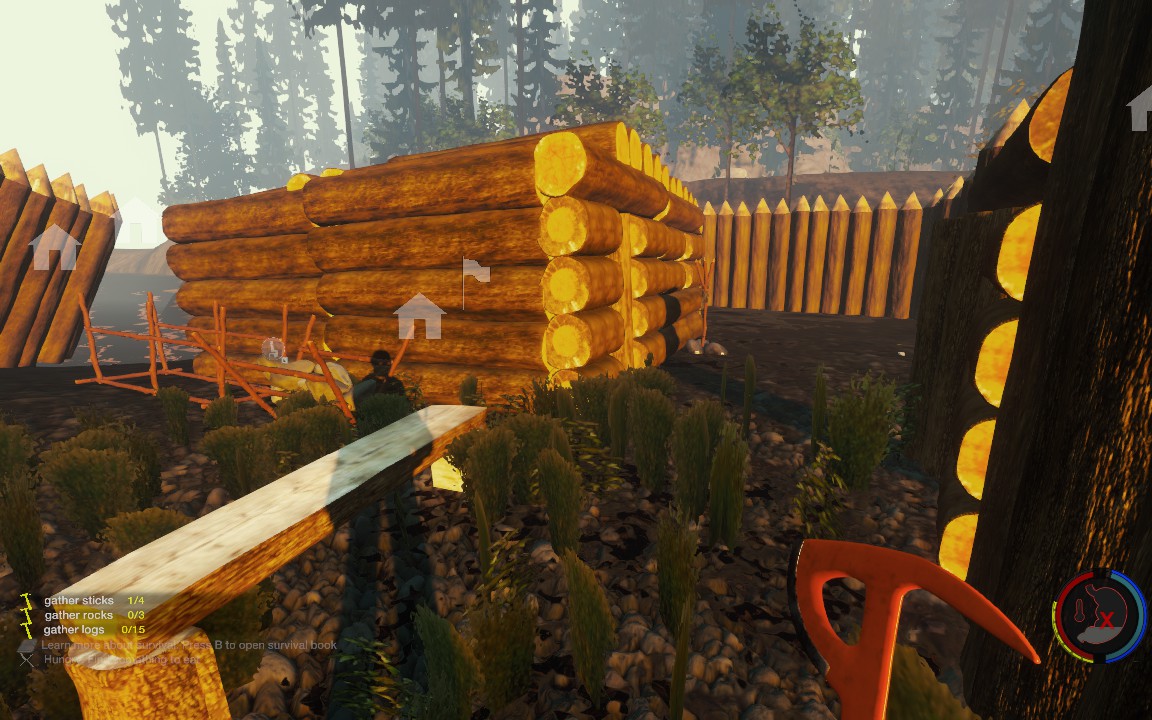 Bild 4 zeigt meinen ersten Außenposten, der nicht sehr weit vom Hauptlager weg ist und aus einer Aussenwand und einem Gebäude besteht. Bild 5 zeigt das ganze dann nochmal von innen. Bild 6 zeigt dann schließlich meinen zweiten Außenposten, der riskanterweise direkt an einem Einwohnerdorf liegt und leider noch im Bau ist, jedoch wird die Fertigstellung aufgrund der (von Gronkh abgeschauten) Bauweise nicht sehr lange dauern.