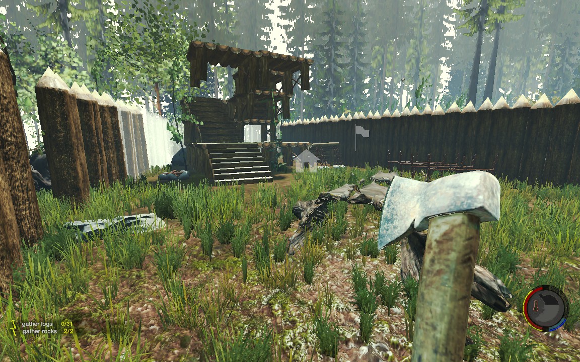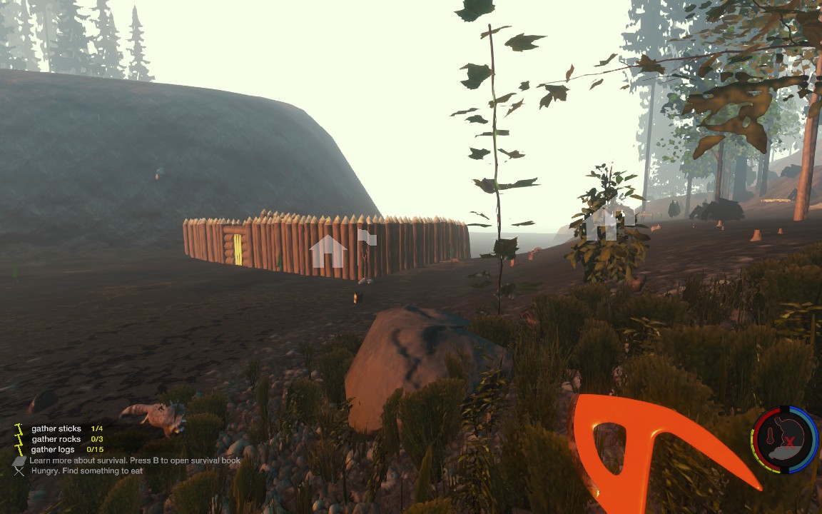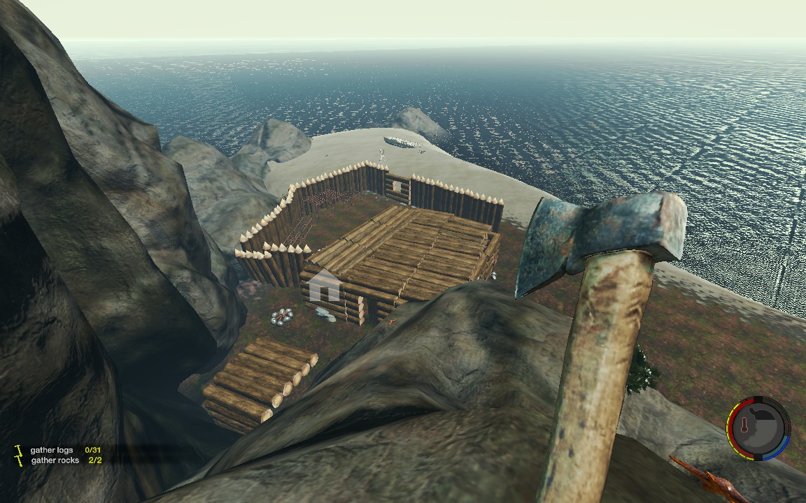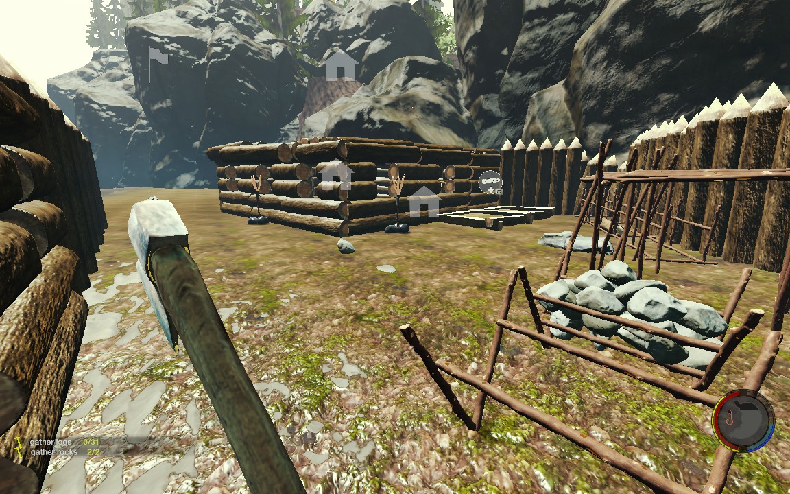 Ich bin mir momentan noch nicht ganz klar darüber, wo genau mein Hauptlager auf der Karte ist, aber Bild 1 zeigt jedenfalls schonmal mein Hauptlager von innen. Das Lager ist perfekt hinter einem Felsen versteckt und hat nur einen einzigen und dazu noch relativ schmalen Zugang, den ich mit Defensive-Walls nochmal ein wenig verengt habe.