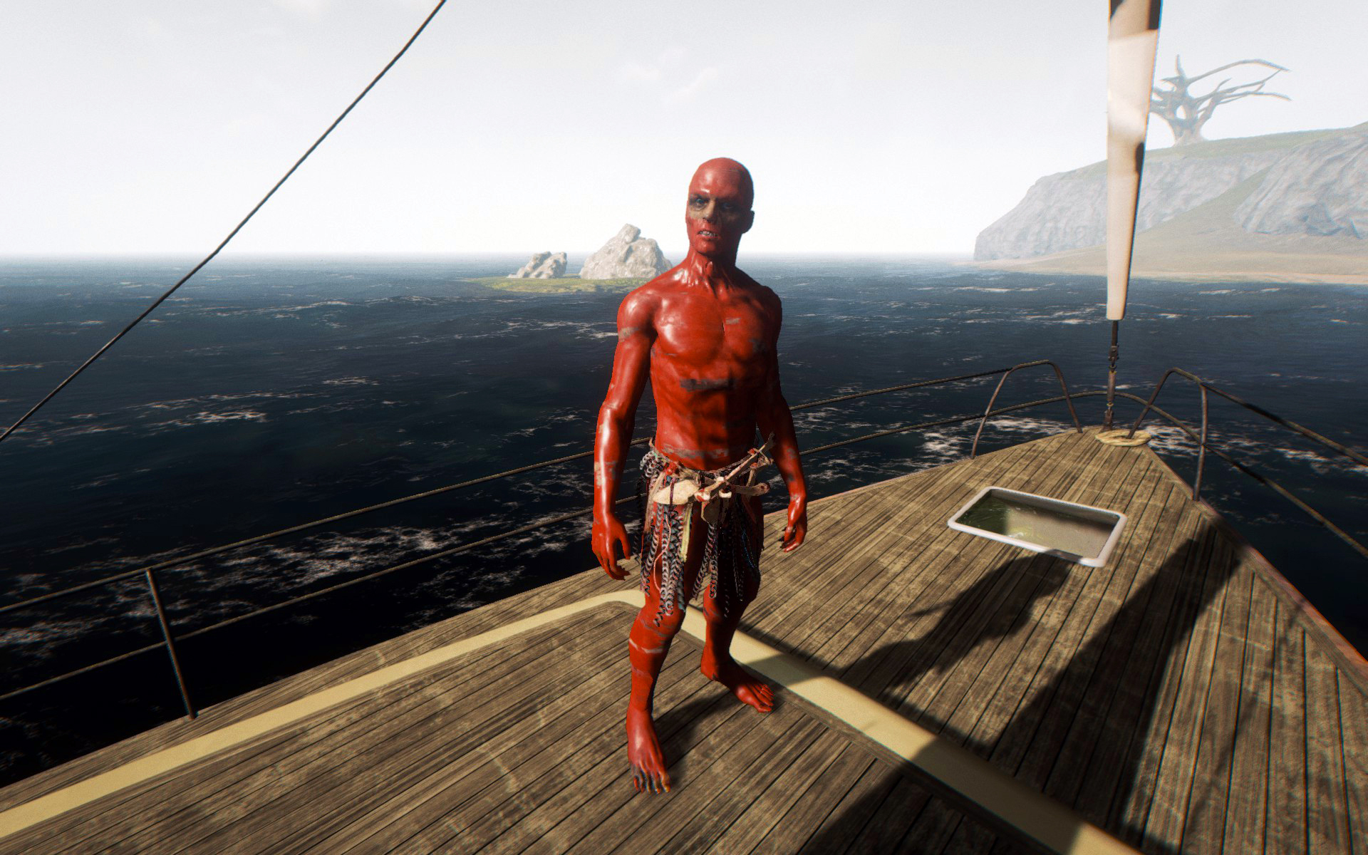 Wenn das die natürliche Hautfarbe sein soll, gibt es nur eine logische Erklärung dafür. Unser Kannibale besitzt die gleichen Proteine und Pigmente, wie sie auch Krebse/Hummer haben. Beim Baden hat er dann nicht aufgepasst und ist einer heißen Unterwasserquelle zu nahe gekommen...seitdem sitzt er auf dem kleinen Boot fest, weil er sich nicht mehr ins Wasser traut