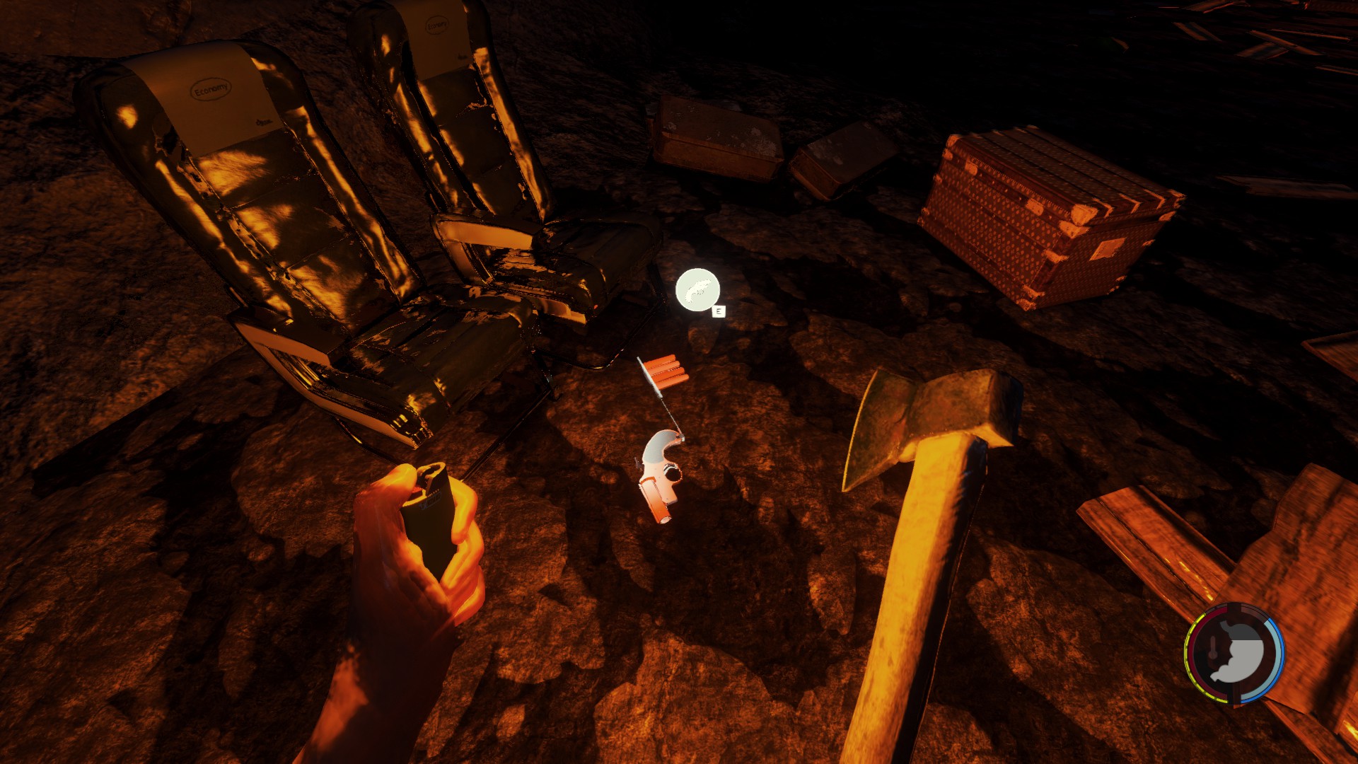 - Hält man einen anderen Gegenstand in der Hand als die Flugzeugaxt und wirft man entweder Tennisbälle oder kleine Steine oder nimmt einen Gegenstand vom Boden auf, der bereits im Inventar ausreichend vorhanden ist, wird automatisch zur Flugzeugaxt gewechselt. Items müssen dann neu aus dem Inventar selektiert werden