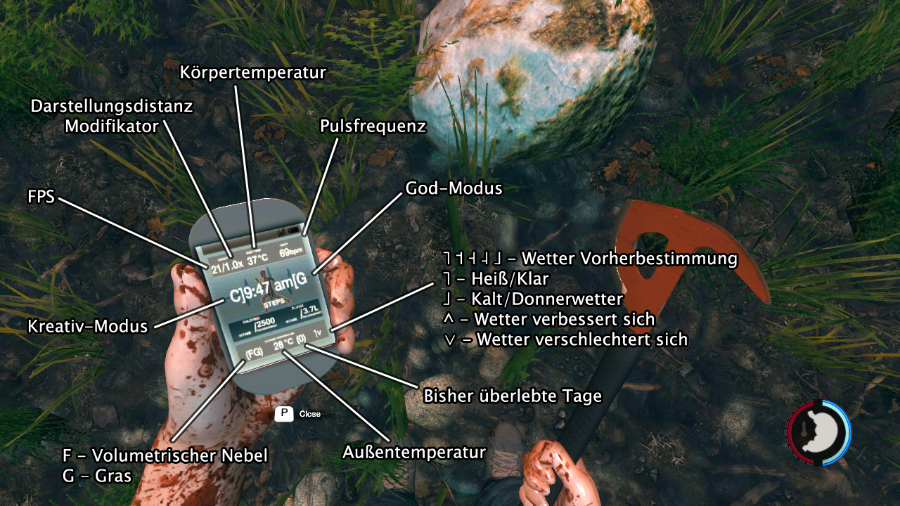 In vorigen Versionen von The Forest konnte man mittels gedrückter L-Taste die FPS im oberen rechten Bildschirmrand anzeigen - dieser Bereich ist jetzt jedoch nicht mehr verfügbar, weswegen Templar die Anzeige seiner Werte auf das Ped-o-Meter übertragen musste. Zum einfachen Verständnis was was besagt, ist hier eine Auflistung inklusive Screenshot der Werte und deren Bedeutung (anhand der angezeigten Werte aus dem Beispielbild!):