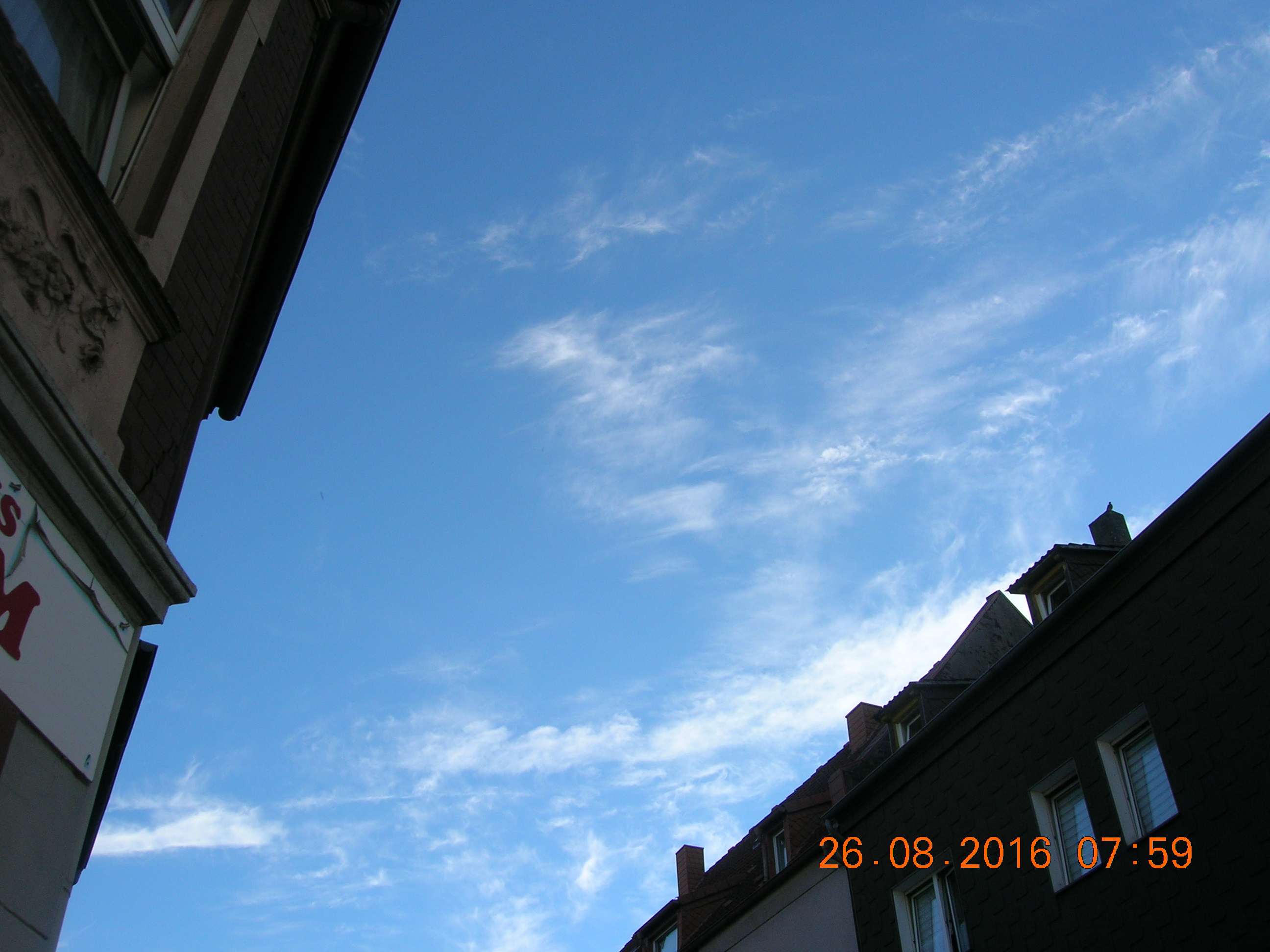 Anscheinend ist die NWO so frustriert, das die Himmelsvergewaltiger am Horizont fast pausenlos Nanometalle in die Atmosphäre sprühen... Der Himmel direkt über mir überwiegend blau, bis auf ein paar kleine Chemieschleier. Die nächsten Tage werde ich mal ein Heilmittel, das heißt MMS (Natriumchlorit + Citronensäure) bei stark bedeckten Himmel probieren. Man vermischt beides, rührt es um, und es beginnt zu dampfen. Da man mit diesen Heilmittel nicht mit Metall in Berührung kommen sollte, werde ich schauen wie sich MMS in den oberen Luftschichten auswirkt. Da hier so gut wie kein Mensch (ICH ZWINGE ZU NIEMANDEN ETWAS) sich der tödlichen Zwangsvergiftung überhaupt nicht im klaren ist, geschweige den sich mal richtig informiert, und die Menschen überwiegend dumm und Ignorant sind, werde ich es selber in die Hand nehmen. Draußen versuche ich die Menschen über heimliche Operation der Wetterkontrolle aufzuklären, was bekommt man natürlich meistens als Antwort? "Ach das ist alles ganz normal, man kann da nichts gegen tun" Ohh Leute, ihr weißt noch gar nicht was es alles für tolle Sachen gibt!! Und Ausreden wie: Ich habe keine Zeit dafür, oder interessiert mich doch nicht, usw... Ja die Leute sollten sich mal echt darüber Gedanken machen, ob seh dieses verbrecherische System sogar befürworten. Ich frage mich manchmal echt, warum ich mir hier überhaupt die Mühe mache Aufklärungsarbeit zu leisten!! Ist doch alles für`n Arsch!!! Das macht mich innerlich ziemlich wütend. Solange die Tische gedeckt sind, das Smartphone auf volle Leistung läuft, der PC gut zum spielen ist, der Fernseher jeden Tag läuft solange passiert gar nichts, die Menschen schauen sich bei ihrer totalen Vernichtung zu. Fakt ist, ES muß geklärt werden, wieso wir zum Beispiel die Jahre viel zu wenig Sonne abbekommen haben. Dabei ist die Sonnenenergie Lebensnotwendig, und fördert die Produktion von Vitamin D. Und wenn der Körper kein Vitamin D hat, wird der Mensch auf kurz oder lang sehr krank. Und uns wird erzählt es fände einen Klimawandel statt... Und die Menschen GLAUBEN das auch noch, oder mag vielleicht auch sogar sein. Es ist der militärische Industriekomplex der das Wetter immer mehr unter ihrer Kontrolle hat. Geo-Enginering, Haarp, Projekt, Projekt Blue Beam, das sind einige von vielen Sachen die noch kommen werden... Ich sage nur Neue Welt Ordnung, kurz: NWO! Ach und noch etwas, Europa steht aktuell am Rande eines Bürgerkrieges, so wie des großen Krieges, die friedlichen Zeiten sind vorbei, und ich habe sehr große angst für einen Ausbruch... Wenn die Deutschen jetzt nicht mal langsam den Arsch hoch bekommen, dann haben die Deutschen nichts anderes verdient, als unter zu gehen, PUNKT AUS! Und das tut mir sehr weh, sehr sogar, ich kann meine Tränen teilweise gar nicht mehr zurück halten. Das alles weil die Menschen so dumm und ignorant sind, weil fast keiner überhaupt rein gar nichts schnallt. Wie stellen wir den unsere Zukunft vor? Was sagt ihr Mütter und Väter euren Kindern wenn die euch mal fragen: Mama/Papa, wieso habt ihr das zugelassen, WARUM??? Leute habt ihr den Schuß immer noch nicht gehört, müssen erst Atomkraftwerke von Terroristen in die Luft gesprengt werden, damit mal euer Wecker klingelt? Im Falle eines großen, ich meine damit eines GROßEN Krieges: Sollte von deutschem Boden die erste Atomrakete (Von Marionette Obama) in Richtung Rußland fliegen, kann es sein sein das wir mit einem Atomraketenbeschuß weg vom Fenster sind. Und warum, weil sich hier amerikanische Kriegsgeräte auf deutschem Boden befinden. Ah, und Wetterkrieg spielt natürlich auch eine wichtige Rolle im Krieg. Ich brauche da nur Italien zu erwähnen, wo kürzlich ein heftiges Erdbeben zu erleben war. Ob da Haarp mit hinter steckt?? Aber naja, mehr als predigen kann ich auch nicht mehr. Wenn die Menschen meinen, das es denen egal ist, dann sollten sie hinterher auch nicht schreien usw... So, nun packt mal eure Smartphones weg, schmeißt den Fernseher auch gleich in die Tonne und versucht mal das Gehirn ein bißchen zu benutzen, oder besser gesagt einzuschalten! So, danke für eure Aufmerksamkeit, und ich werde nicht aufgeben!