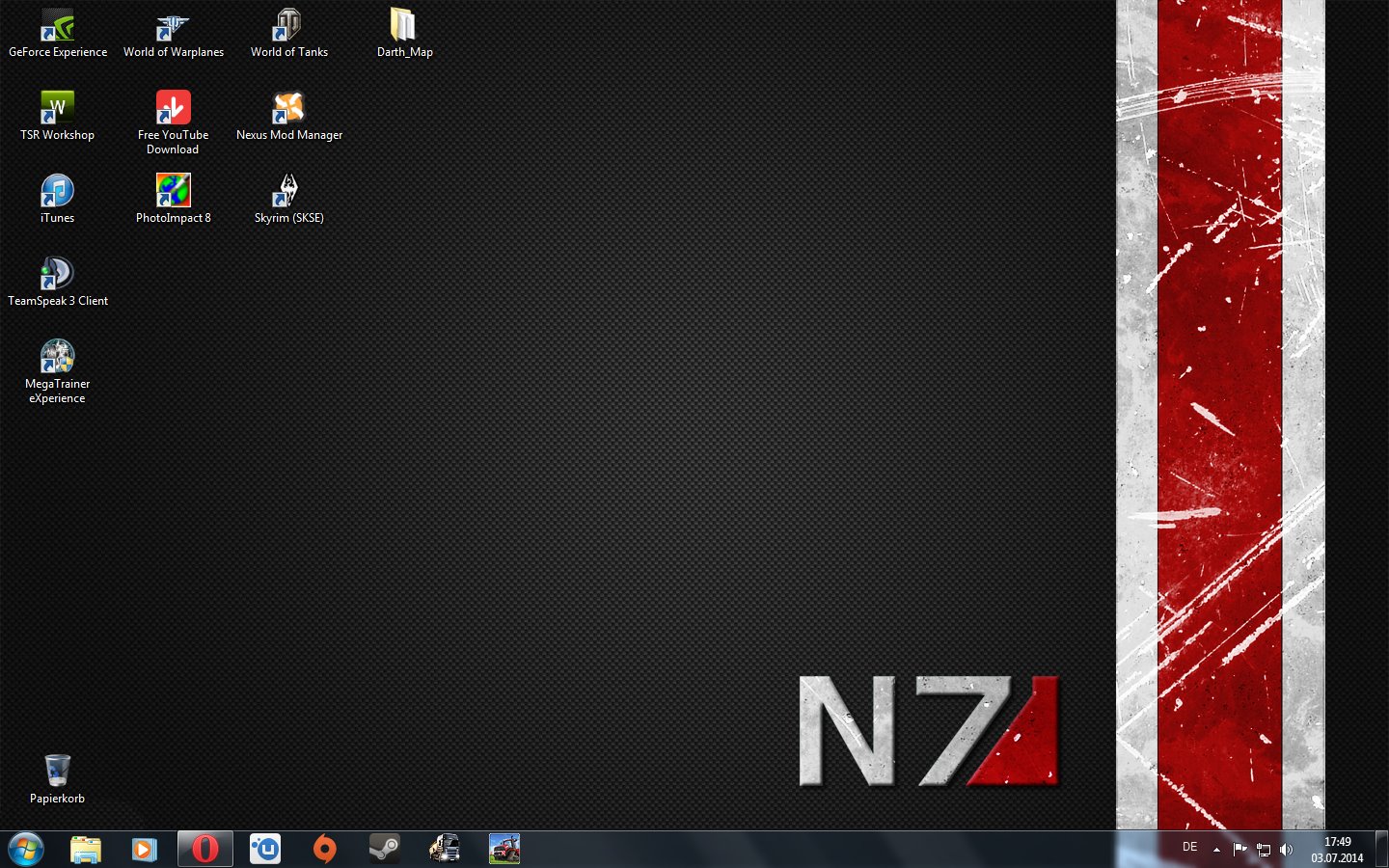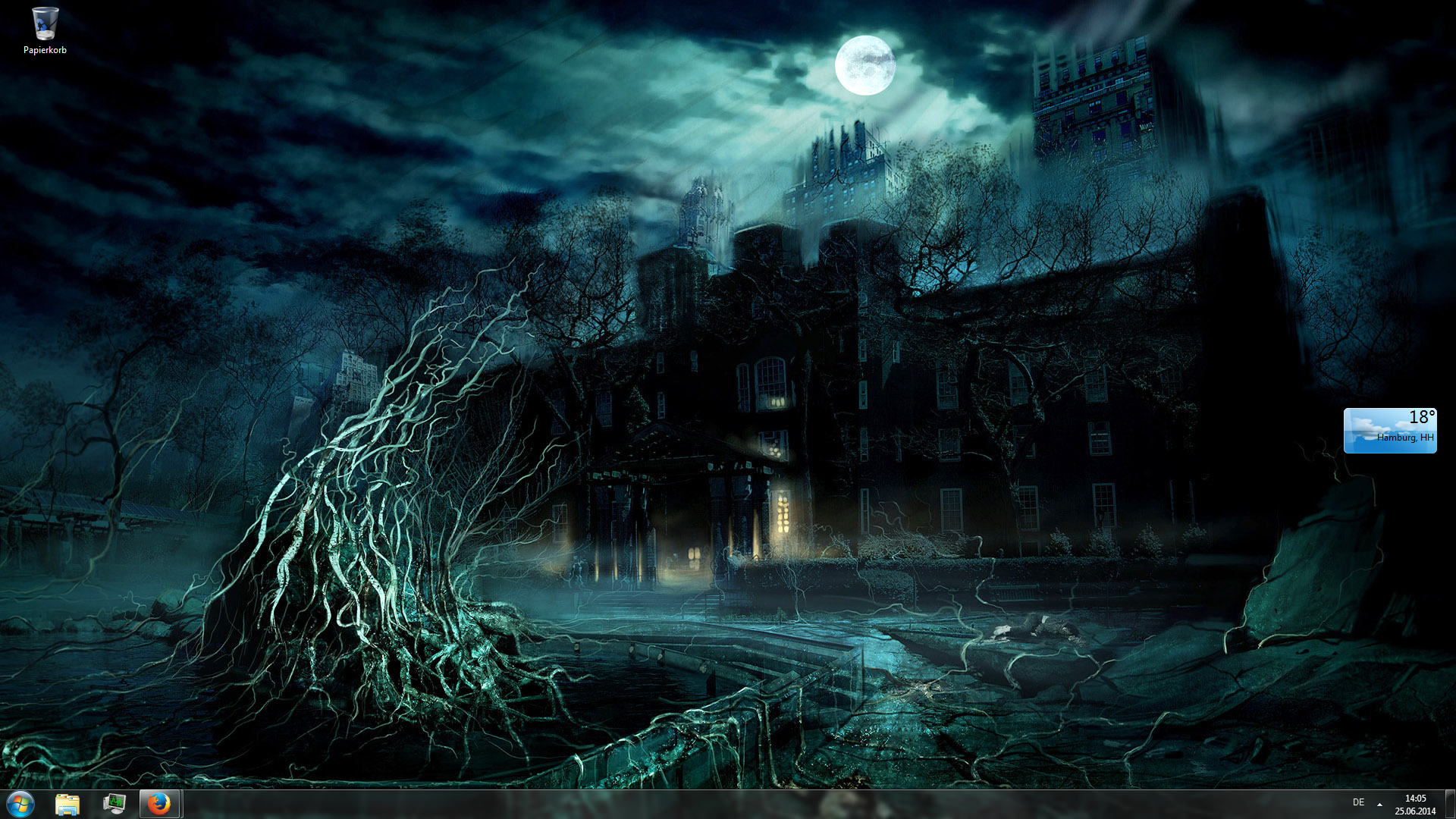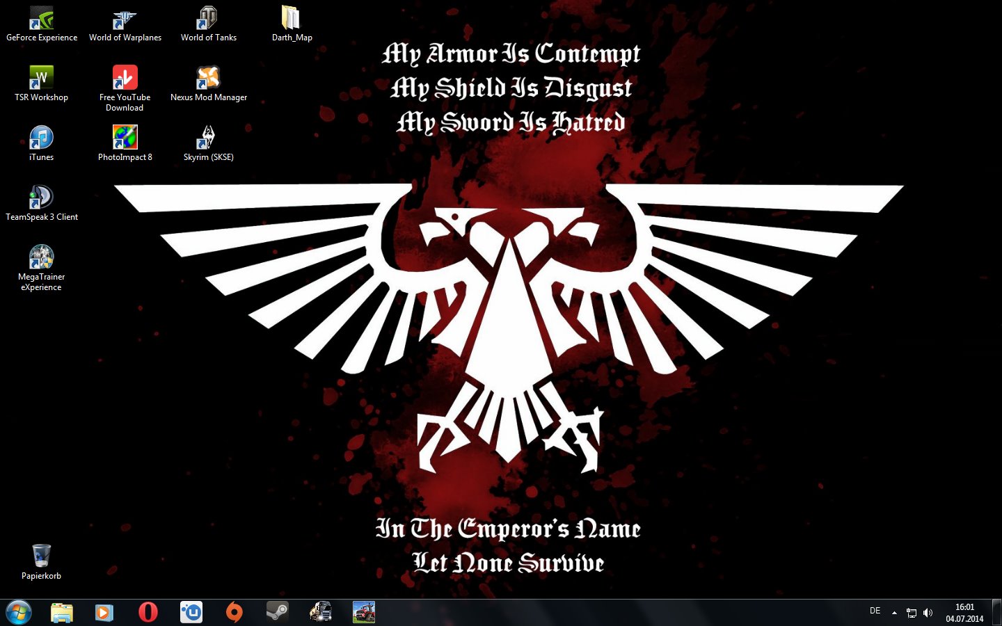 Mein Hintergrund ändert sich alle 15 Minuten. Insgesamt sind knapp 100 Bilder im Ordner. Alle zu zeigen würde den Rahmen sprengen, aber mein derzeitiges ist dieses hier.Ich werd' ihn jagen um die Monde von Nibia, durch den Antares-Mahlstrom und durch die Flammen der ewigen Verdammnis, bevor ich ihn aufgebe!