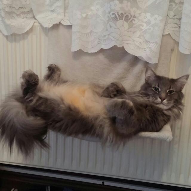 Einmal wie er gemütlich auf der Katzenbrücke chillt (meine ganze Bude ist mit aufbereiteten Holzbrettern usw für die Tierlies aufbereitet) und einmal auf der Lehne meines Sessels (ja, ich sitze da drauf während er hinten-oben bei mir liegt