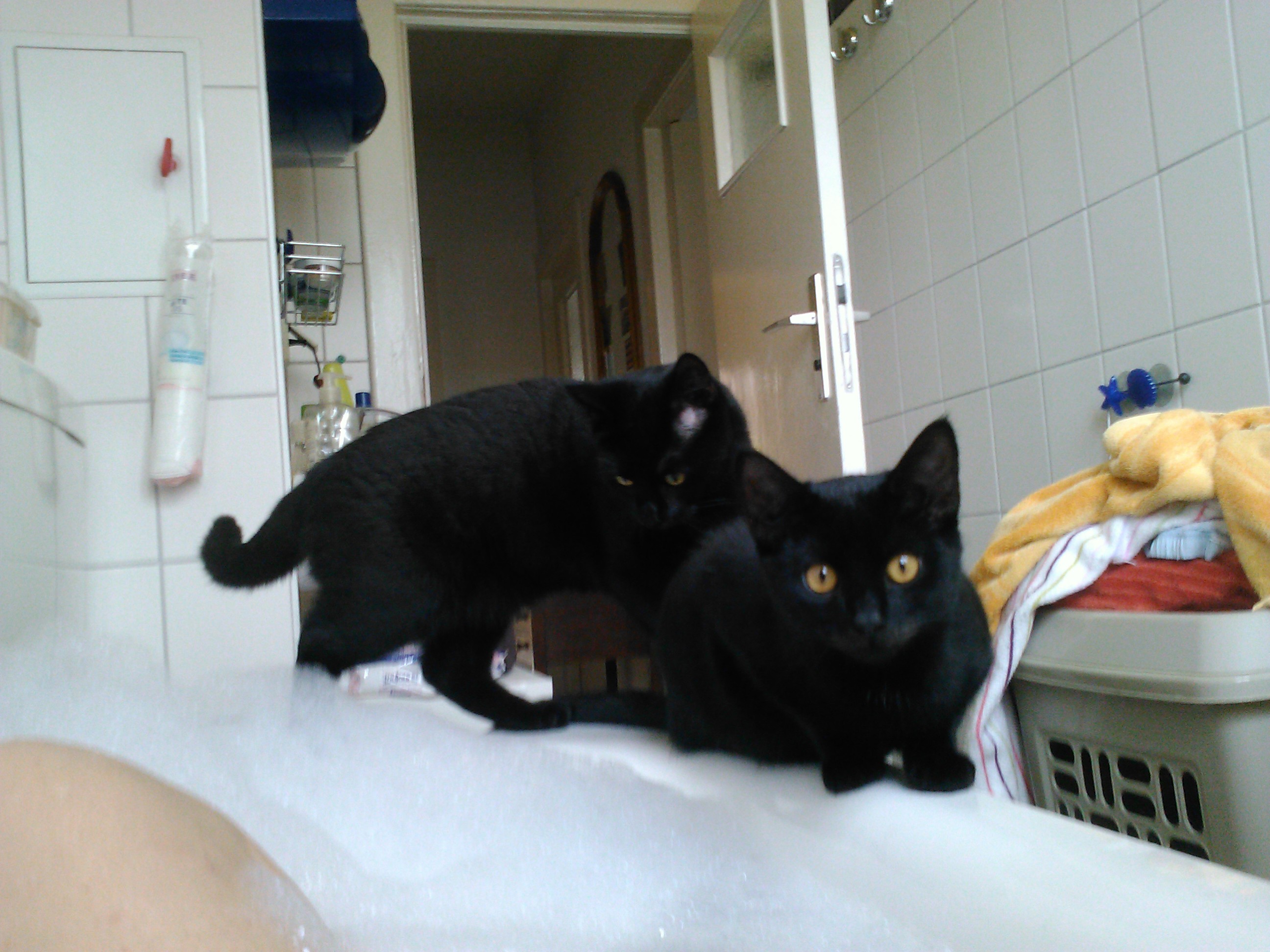 4. Bild in der Badewanne -> das könnte die Schwarzkatze hier bei uns zuhause sein. Die ist nämlich so eine richtige Abenteuerkatze für die es kein "geht nicht" gibt. Die kommt überall hin, überall rauf und muss auch überall rein und dazu