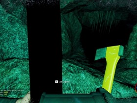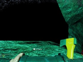 Wiederim Wasser erreiche ich irgendwann den grüßenden Kumpel in einer weiteren Höhle. Hier ist aber dann Ende. Offensichtlich wird hier noch gebaut denn eine schwarze Wand signalisiert nicht den freien Fall, sondern wirkt eher als Vorhang.
