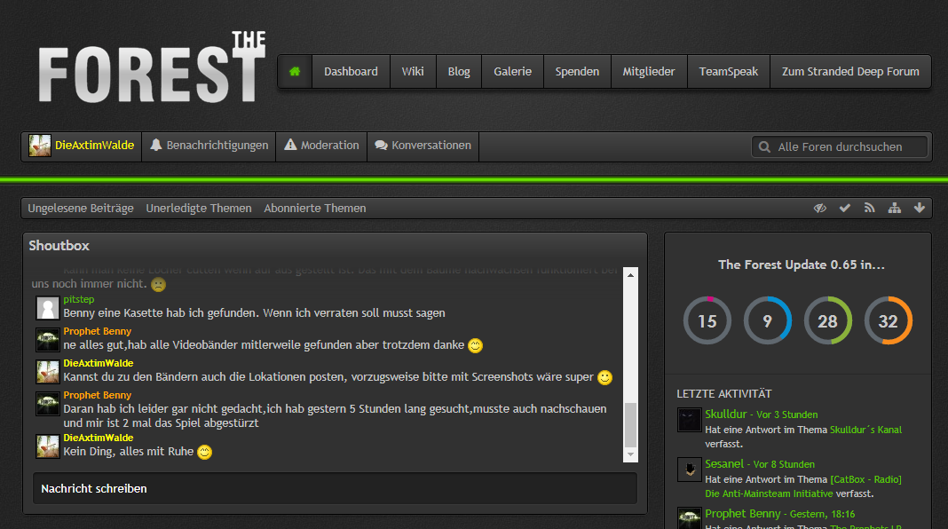 Einige von euch kennen es noch vom Blog: Eine Anzeige wie lange es bis zum nächsten Update von The Forest noch hin dauert. Da unser Blog seit einiger Zeit nicht mehr aktiv auf den aktuellsten Stand gebracht wird, seit dem Serverumzug aufgrund Fehleranfälligkeit (Exploits, etc) ganz weggefallen ist, gibt es nun wieder einen Countdown. Diesmal aber schön für alle auf der Startseite des Forums, rechts in der Seitenleiste